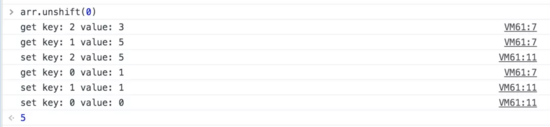 unshift 操作会导致原来索引为0,1,2,3的值发生变化,这就需要将原来索引为0,1,2,3的值取出来,然后重新赋值,所以取值的过程触发了 getter ,赋值时触发了 setter 。