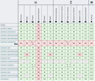 并且目前并没有一个完整支持 Proxy 所有拦截方法的Polyfill方案,有一个google编写的proxy-polyfill 也只支持了 get,set,apply,construct 四种拦截,可以支持到IE9+和Safari 6+。