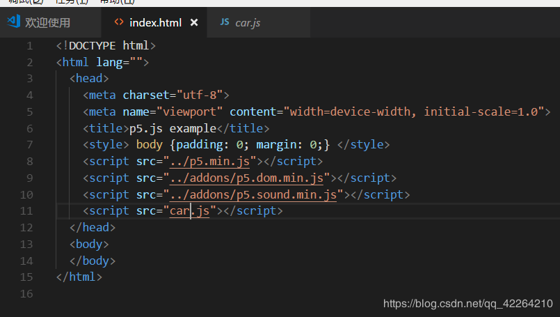 首先我们建立一个index.html文件(主页)和一个car.js文件(码绘实现文件),并把car.js和p5.js链接到index.html上。