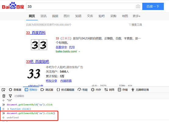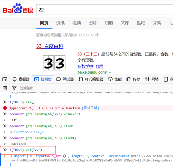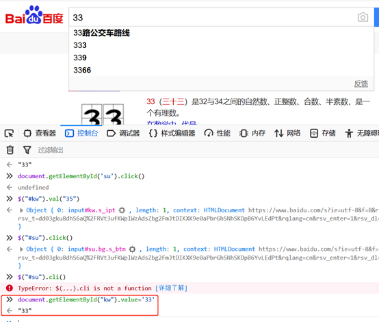 输入 document.getElementById('kw').value='33' 直接回车,如图:
