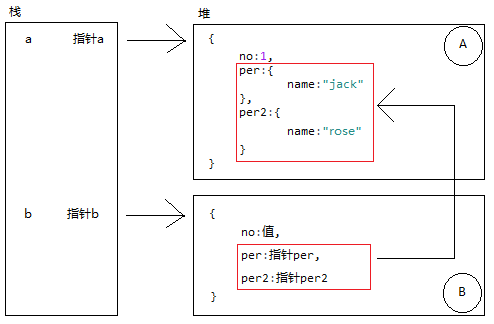//在栈开辟一个空间b,存放b的指针地址,设指针地址为address2b,同时在堆开辟一个空间,设这空间为B,存放b对象数据