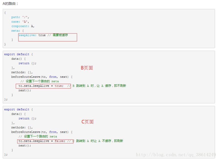 思路:通过beforeRouterLeave这个钩子来对路由里面的keepAlive进行赋值。从而动态的确定A页面是否需要被缓存。