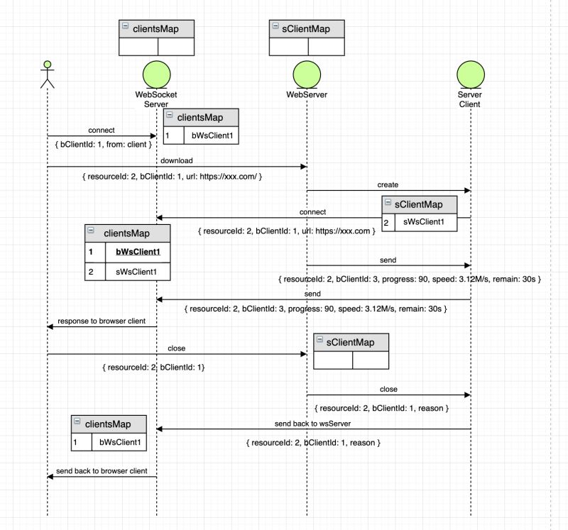 服务端收到进度以及速度的消息后,回传给客户端,如果进度达到了100%,那么就删除掉存在server中的服务器中起的websocket的客户端,并且发送一个客户端被关闭的通知,通知浏览器已经下载完成。