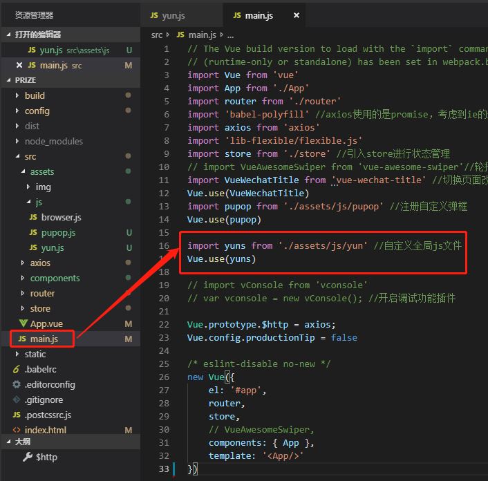 3.0 下面将yun.js文件注册到vue的全局中去,需要在main.js文件下面注册全局:如图下