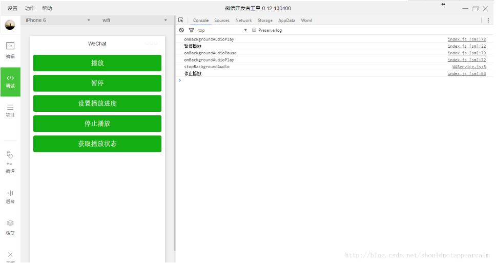 //index.wxml <button class="button-style" type="primary" bindtap="listenerButtonPlay">播放</button> <button class="button-style" type="primary" bindtap="listenerButtonPause">暂停</button> <button class="button-style" type="primary" bindtap="listenerButtonSeek">设置播放进度</button> <button class="button-style" type="primary" bindtap="listenerButtonStop">停止播放</button> <button class="button-style" type="primary" bindtap="listenerButtonGetPlayState">获取播放状态</button>