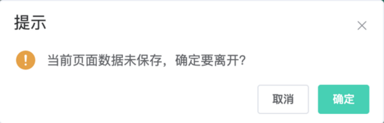 this.$confirm('当前页面数据未保存,确定要离开?', '提示', { type: 'warning' })