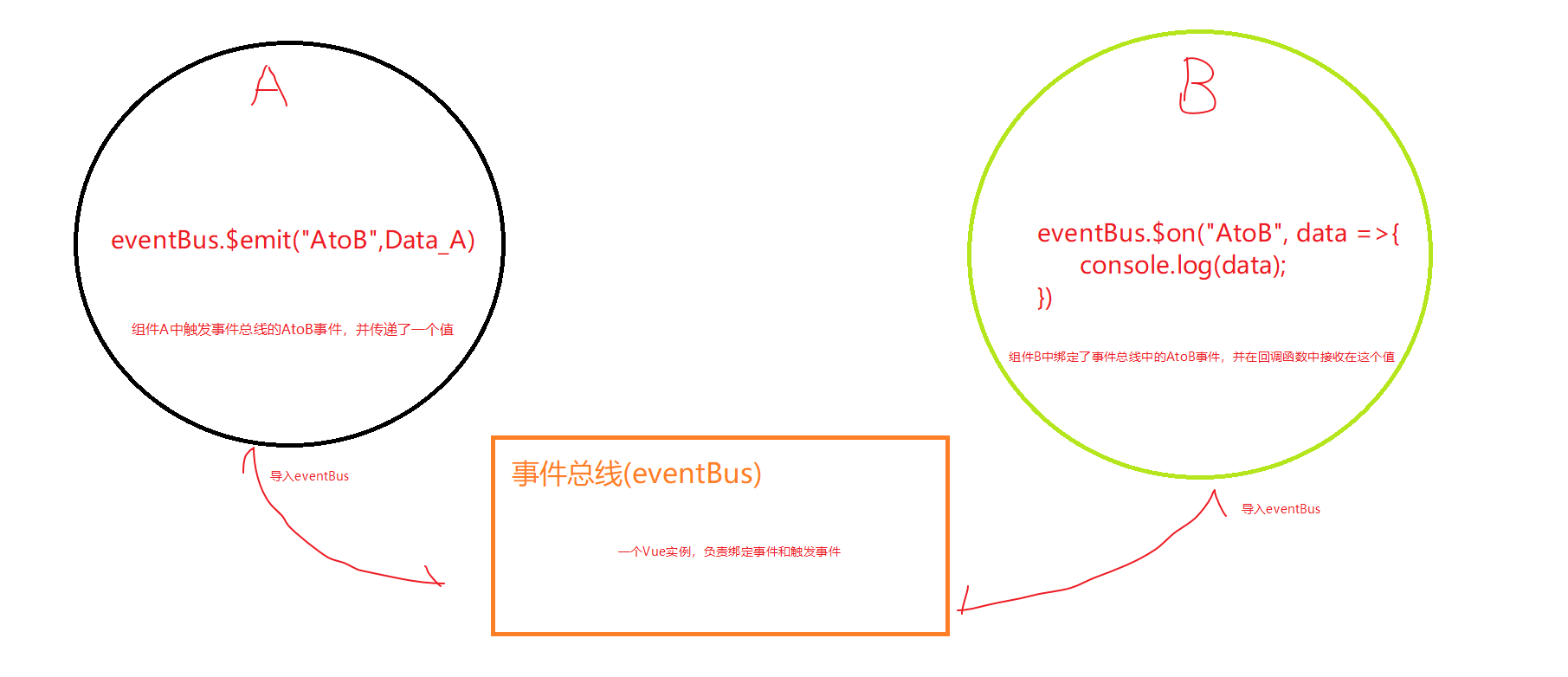然后,在A组件中导入eventBus, 并触发自定义的AtoB事件