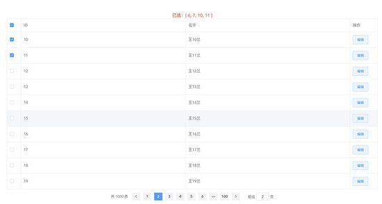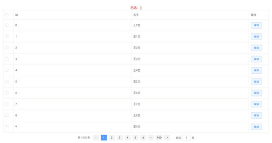 <el-table class="table" :data="tableData" border style="width: 100%" @selection-change="handleSelectionChange" ref="asTable" > <el-table-column width="50" type="selection" fixed="left" > </el-table-column> <el-table-column prop="id" label="ID" > </el-table-column> <el-table-column prop="name" label="名字" > </el-table-column> <el-table-column label="操作" width="100" > <template slot-scope="scope"> <el-button type="primary" plain size="small" @click="handleEdit(scope.row)" >编辑</el-button> </template> </el-table-column> </el-table> <el-pagination background @current-change="handleCurrentChange" :current-page.sync="pagination.currentPage" :page-size="pagination.size" layout="total, prev, pager, next, jumper" :total="pagination.total" slot="pagination" > </el-pagination>