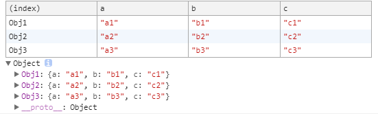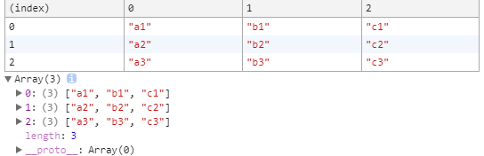 var Arr = [ ["a1","b1","c1"], ["a2","b2","c2"], ["a3","b3","c3"], ] console.table(Arr);