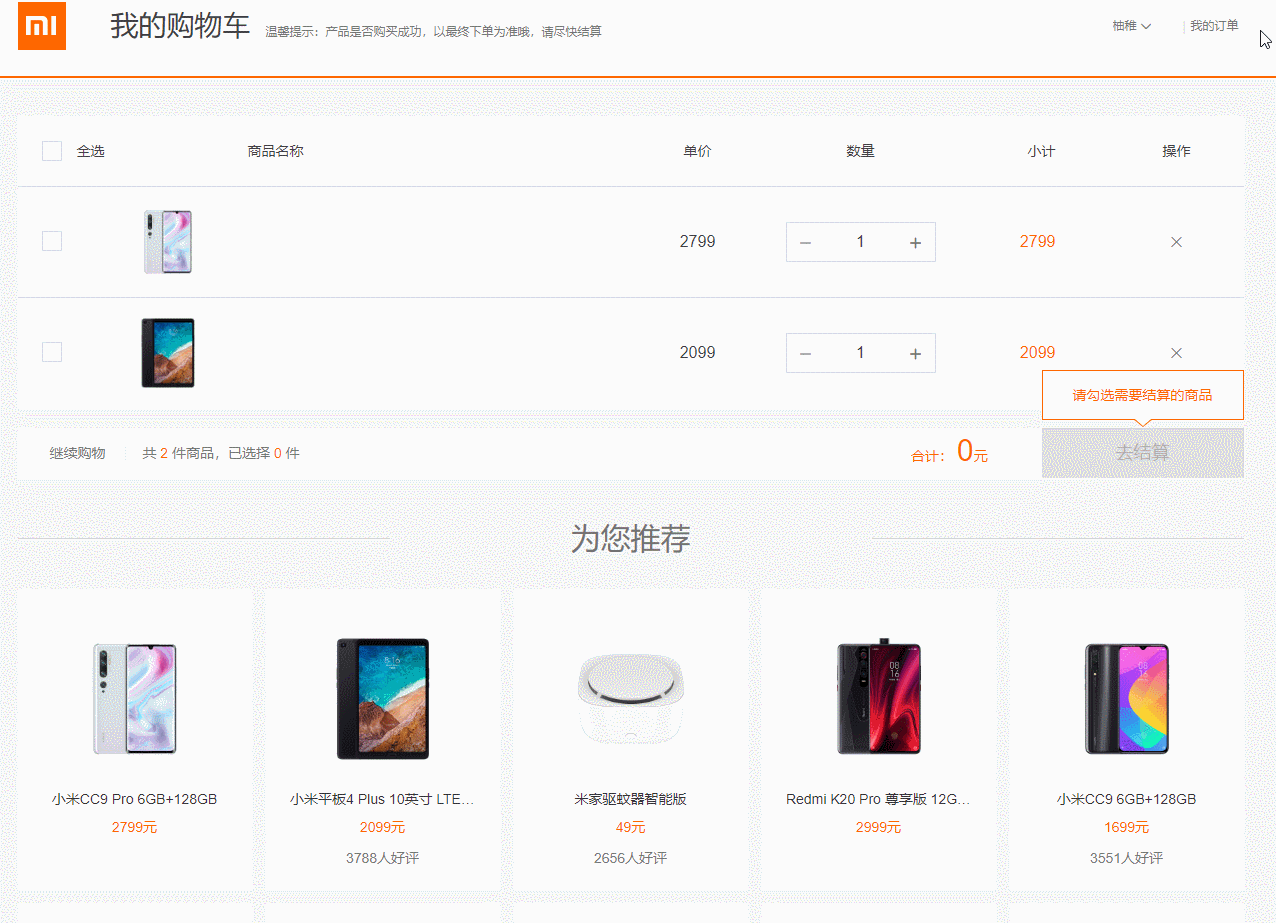 这上面一个对象就是页面上购物车展示的整条商品的所有信息内容,前面三项都是拿到items中的id到products模块中查询到的字段,接着三项都是items中每条数据的字段,最后一项就是计算了一下当前这条商品的总价,就是拿这件商品的单价乘以这条商品内商品的数量。这个对象严格来说是合并了状态的,因为你拿到的数据是不可能满足购物车中所有的要求的,所以还是有些字段需要你自己定义添加,为什么一些公用的字段不在products中的recommendList每一项添加呢?比如checkoutStatus字段,因为我的商品数据是直接拿小米的部分返回的数据的,我直接放在了本地mock.js模块中,我就没有对那些官方的数据作修改。所以我就把checkoutStatus这个字段添加到items中了,效果也是不影响逻辑的。