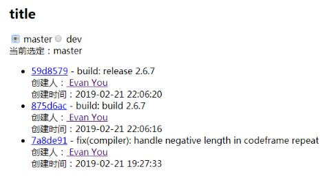 这个例子从 Github 的 API 中获取了最新的 Vue.js 提交数据,并且以列表形式将它们展示了出来。你可以轻松地切换 master 和 dev 分支。