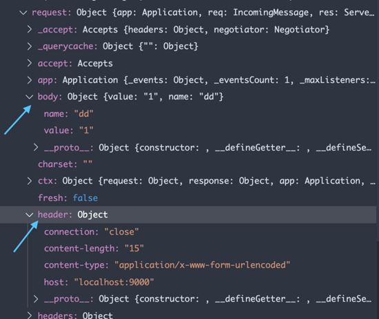 使用 node debug 查看接收到的 request.body是后端接收到的值 request.header是接收到的请求 content-type