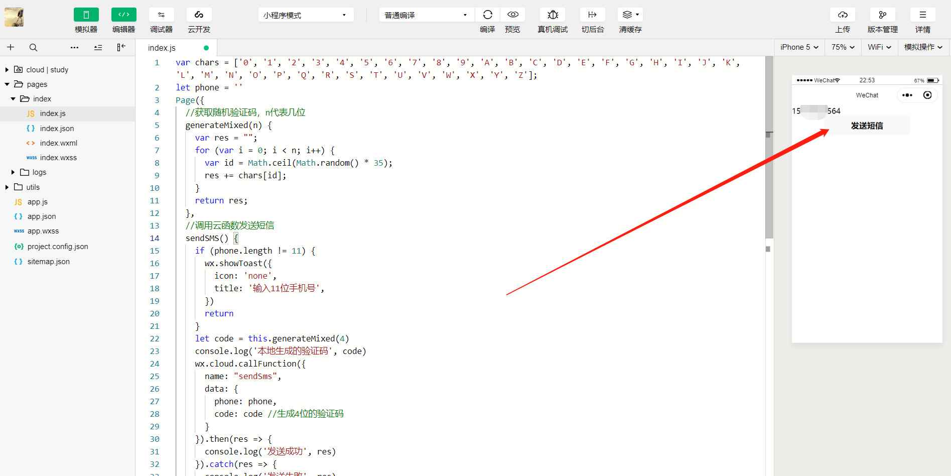 调用云函数这里也很简单,我们需要传入手机号和验证码