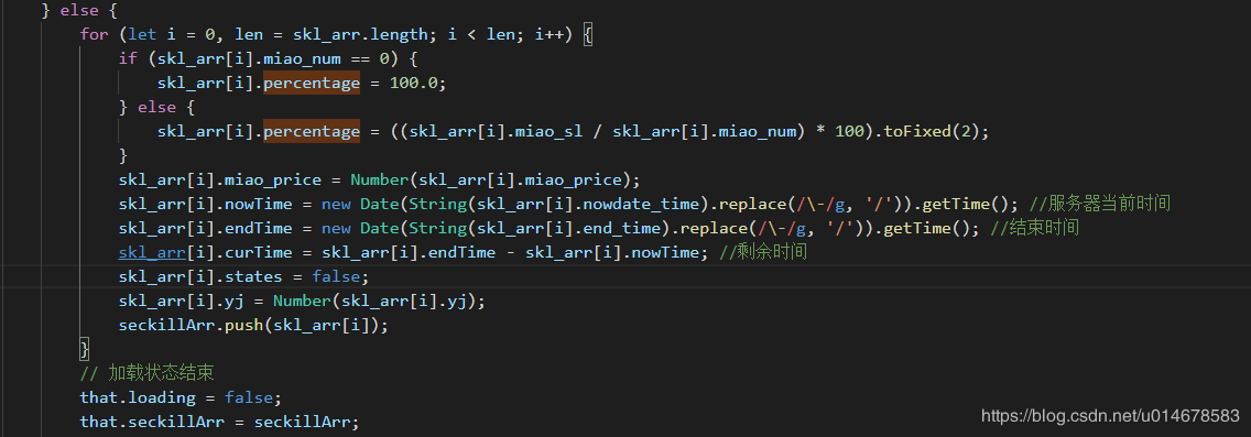 1、skl_arr[i].nowdate_time,skl_arr[i].end_time都是后台提供的字段,格式为"2020-01-02 18:40:48",当然你也可以让后台返回时间戳给你,这样就更方便前端了(省掉new Date(String(XX).replace(/\-/g, '/')).getTime()这一步转换时间戳,其中.replace(/\-/g, '/')为兼容苹果时间显示问题)
