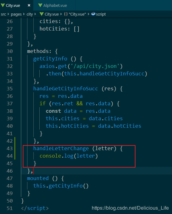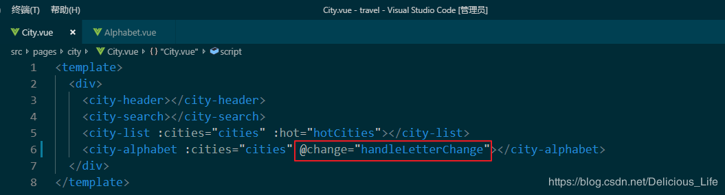 首先我们要在city页面定义一个letter变量,然后在方法中定义用这个变量接受letter