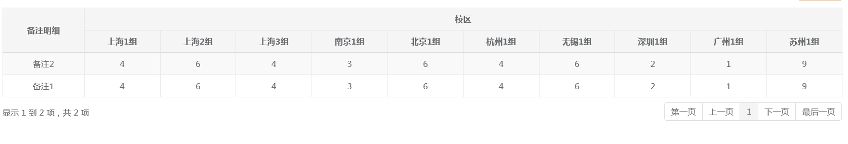 <input type="hidden" name="thead_key" id="thead_key" value="<?php if(isset($thead_key)):?><?php echo $thead_key;?><?php endif;?>"> <input type="hidden" name="thead_num" id="thead_num" value="<?php if(isset($thead_num)):?><?php echo $thead_num;?><?php endif;?>"> <table class="table text-nowrap table-striped table-bordered table-hover dataTables_list"> <thead> <tr> <th rowspan="2"><div align="center">备注明细</div></th> <?php if(isset($thead_arr)):?> <th colspan="<?php echo count($thead_arr);?>"><div align="center">校区</div></th> <?php endif;?> </tr> <?php if(isset($thead_arr)):?> <?php foreach($thead_arr as $val):?> <th><div align="center"><?php echo $val;?></div></th> <?php endforeach;?> <?php endif;?> </thead> </table>
