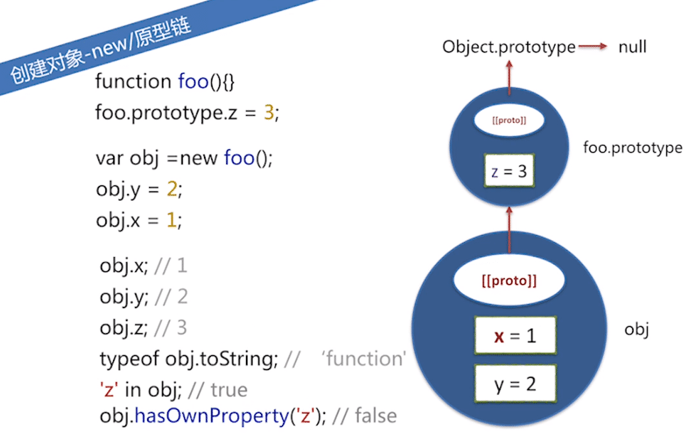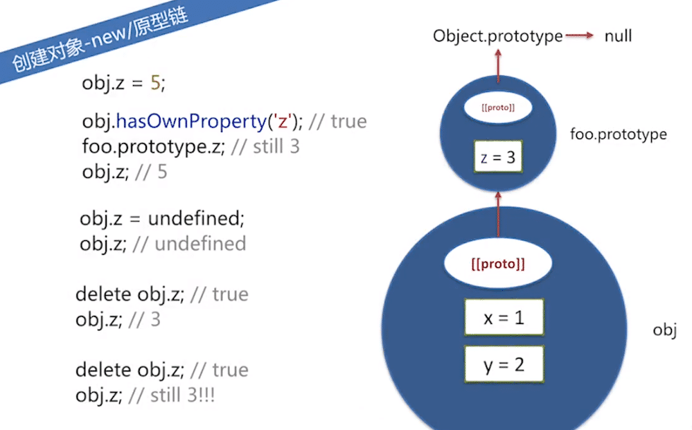 3.变量z在原型链上,为foo.prototype的属性,并非obj的自有属性。