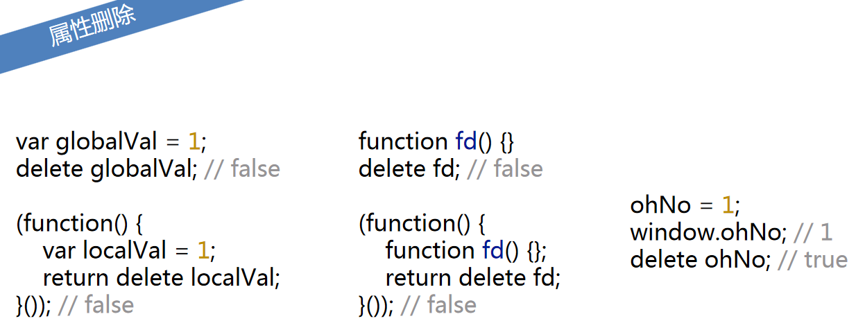 1.delete全局变量和局部变量返回false,但是delete自动提升的全局变量返回true(不推荐)。