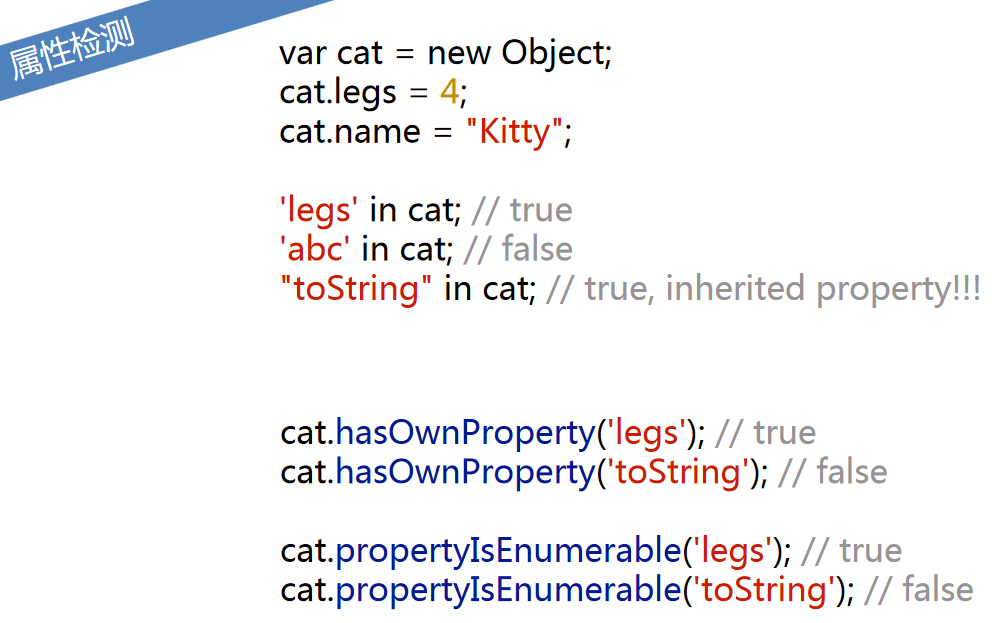 2.in运算符会查找原型链,若想不查找原型链,则使用getOwnProperty方法。