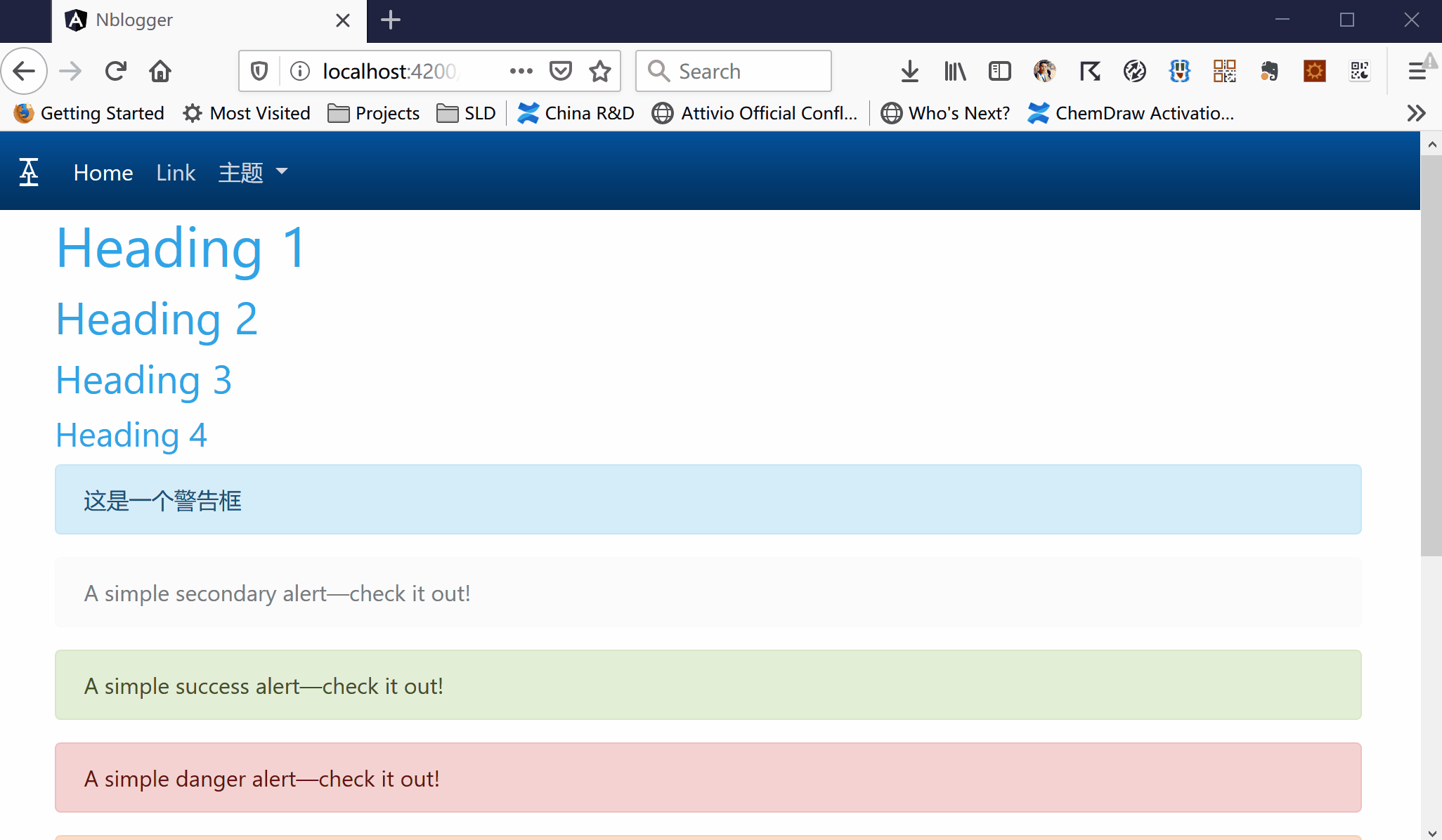 <app-nav-bar [themes]="themes" [selectedTheme]="selectedTheme" (themeSelectionChanged)="onThemeSelectionChanged($event)"></app-nav-bar> <div class="container"> <article> <h1>Heading 1</h1> <h2>Heading 2</h2> <h3>Heading 3</h3> <h4>Heading 4</h4> </article> <div class="alert alert-primary" role="alert"> 这是一个警告框 </div> <div class="alert alert-secondary" role="alert"> A simple secondary alert—check it out! </div> <div class="alert alert-success" role="alert"> A simple success alert—check it out! </div> <div class="alert alert-danger" role="alert"> A simple danger alert—check it out! </div> <div class="alert alert-warning" role="alert"> A simple warning alert—check it out! </div> <div class="alert alert-info" role="alert"> A simple info alert—check it out! </div> <div class="alert alert-light" role="alert"> A simple light alert—check it out! </div> <div class="alert alert-dark" role="alert"> A simple dark alert—check it out! </div> <button type="button" class="btn btn-primary">Primary</button> <button type="button" class="btn btn-secondary">Secondary</button> <button type="button" class="btn btn-success">成功</button> <button type="button" class="btn btn-danger">失败</button> <button type="button" class="btn btn-warning">警告</button> <button type="button" class="btn btn-info">信息</button> <button type="button" class="btn btn-light">Light</button> <button type="button" class="btn btn-dark">Dark</button> <button type="button" class="btn btn-link">Link</button> </div>