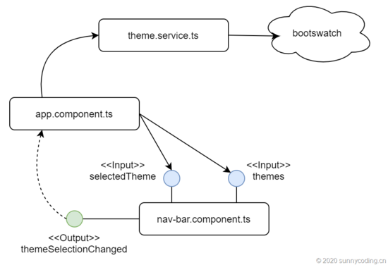 在开工之前,还是要做一些粗略的设计。为了简单起见,我使用Bootstrap的Navbar来完成这个功能,因为Navbar的代码可以直接从Bootstrap官网拷贝过来,稍微改改就行。不同的是,我将Navbar封装在一个组件(Component)里,这样做的好处是,可以将切换主题的功能封装起来,以实现模块化的设计。下图展示了这一设计: