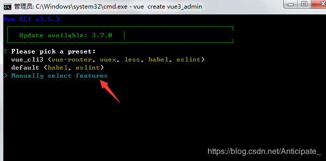 开始创建vue项目,打开你需要创建文件的目录,打开命令行输入 vue create 项目名称,点击回车