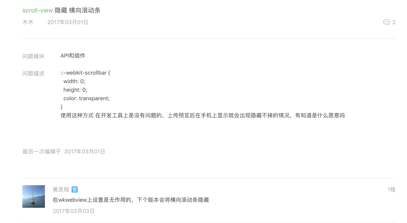小程序的scroll-view用的比较多了,列表页一般也没管它的滚动条,最近突然发现在android与ios中横向滑动的时候表现不一样。不一样在哪呢,ios上直接就不显示啊,也是没谁了。深入想了一下,这滚动条能不能换一颜色或者换个样式。有这冲动就立马着手改。