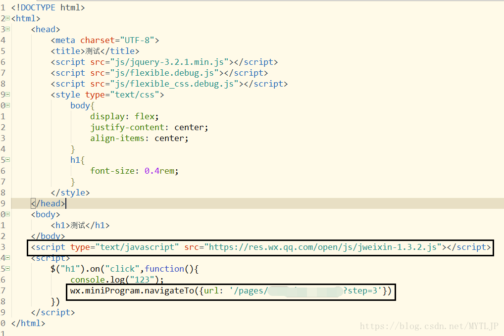 请看下图的代码,我大致H5里面也就写了一个h1标签,用来点击操作跳转到小程序中。