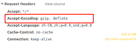 首先浏览器在发送请求的时候,会通过请求头Accept-Encoding告知服务器,本浏览器支持哪些编码格式的资源。打开浏览器的network,查看当前网页的某个请求的请求头: