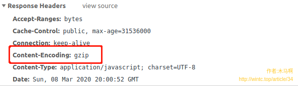 如果服务器对资源进行压缩编码了,它就会通过响应头Content-Encoding告知当前请求用了什么编码格式,当然如果服务器没干这事,则不会返回这个响应头,比如某个请求用gzip压缩了返回的内容: