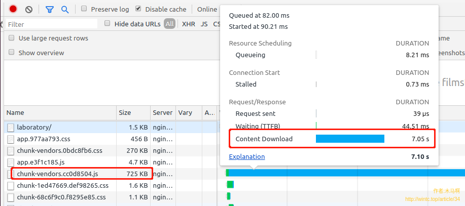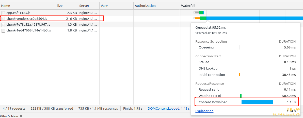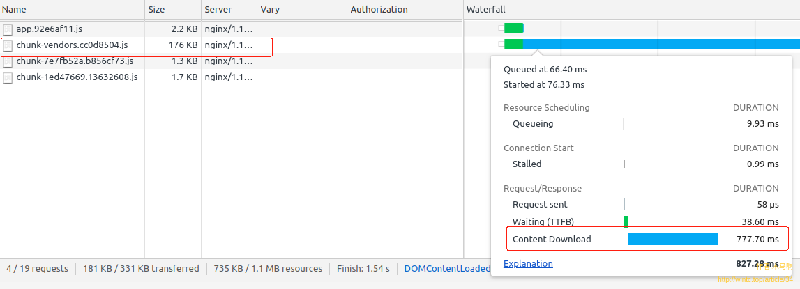 如果把鼠标悬指到chunk-vendors的size上,可以看到提示“176KB transfered over network, resource size: 724K”。如果你的项目出现请求资源文件太大,可以试试gzip之类的压缩手段,相信有立竿见影的效果。