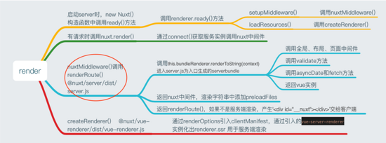 上面的代码为vue的ssr渲染提供了方案,但是对于使用nuxt框架的同学而言,用脚手架初始化完,框架对于vue服务端渲染的res.end()函数做了高度封装,从下图nuxt在接收到请求后进行渲染的流程可以看出,nuxt主要是通过nuxtMiddleware调用renderRoute()来进行渲染的: