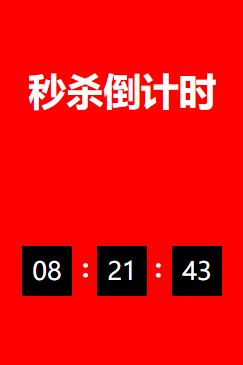 <div id="box"> <div class="txt">秒杀倒计时</div> <div class="hour"></div> <!-- 小时与分钟之间的冒号 --> <span class="h_m">:</span> <div class="minute"></div> <!-- 分钟与秒之间的冒号 --> <span class="m_s">:</span> <div class="second"></div> </div>