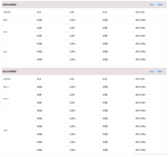 pay: [{ area: 'pay1', type: 1, region: '1', weight: '首重p', weight_incre: '续重p', first_price: '运费p', extend_price: '最终运费p' }, { area: 'pay', type: 1, region: '1', weight: '首重p', weight_incre: '续重p', first_price: '运费p', extend_price: '最终运费p' }, { area: 'pay', type: 1, region: '1', weight: '首重p', weight_incre: '续重p', first_price: '运费p', extend_price: '最终运费p' }, { area: 'pay1', type: 1, region: '1', weight: '首重p', weight_incre: '续重p', first_price: '运费p', extend_price: '最终运费p' }, { area: 'pay', type: 1, region: '1', weight: '首重p', weight_incre: '续重p', first_price: '运费p', extend_price: '最终运费p' }, { area: 'pay', type: 1, region: '1', weight: '首重p', weight_incre: '续重p', first_price: '运费p', extend_price: '最终运费p' }]