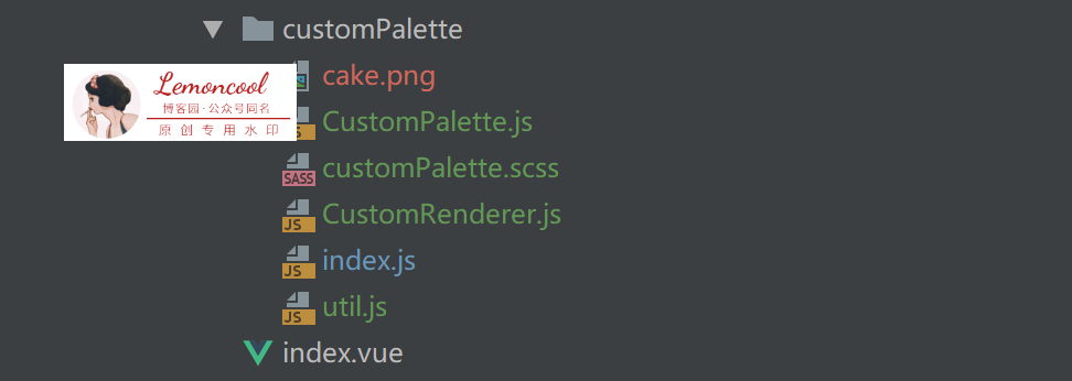项目目录:index.vue是画布主页面,同级customPalette文件夹下共有6个文件,结构如下: