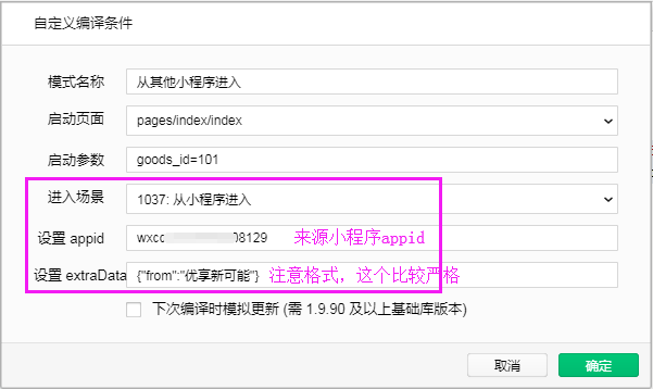 1. 先选择进入场景,输入1037就能快速定位到从小程序进入这个选项,然后就会显示设置appid及extraData的输入框;