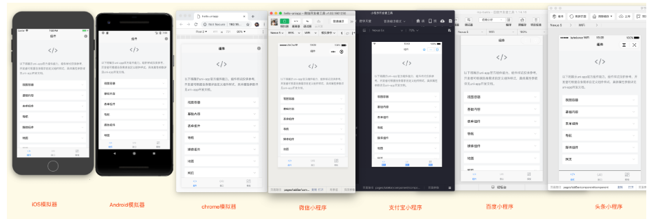 uni-app实现了一套代码,同时运行到多个平台。支持iOS模拟器、Android模拟器、H5、微信开发者工具、支付宝小程序Studio、百度开发者工具、字节跳动开发者工具