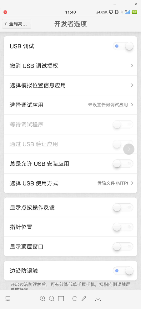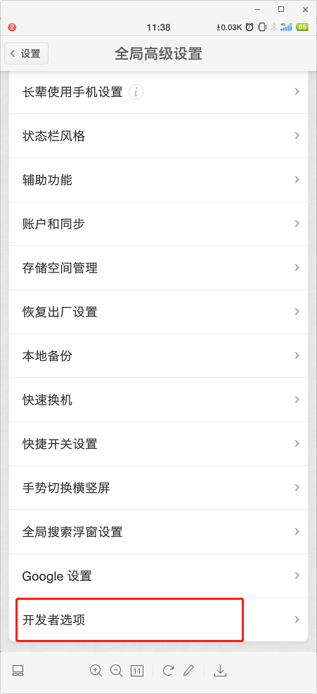 开发者选项的开启和关闭在【设置】 >> 【高级设置】>> 【开发者选项】,如下: