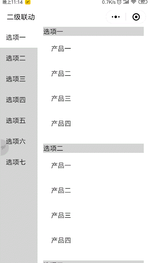 功能实现关键是使用控件scroll-view,下面直接上示例代码。