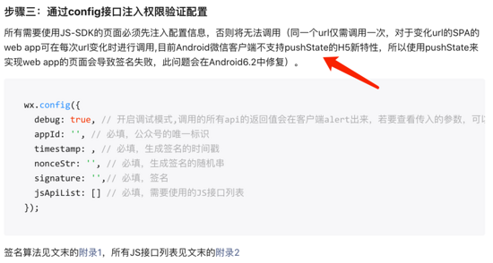 分享后的链接仍然是首页进入的链接,这是微信的BUG啊,原来在微信的网页中不支持 pushState ,这就导致我们在jssdk从配置时传入的 url ( window.location.href 得到)和微信识别到的不一样,这时候在分享的页面刷新一下,配置就会正常。