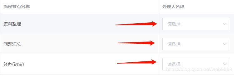 1.在处理人列加入一个下拉框模板,其中v-model必须要scope.row.proJbruserValue来绑定,意思是这个值绑定到当前行所选中的人;如果直接绑定proJbruserValue,将不能进行差异化选择,(这里scope.row.proJbruserValue 相当于对象点属性,在本地临时添加了一个属性来存储不同行的选中处理人id)