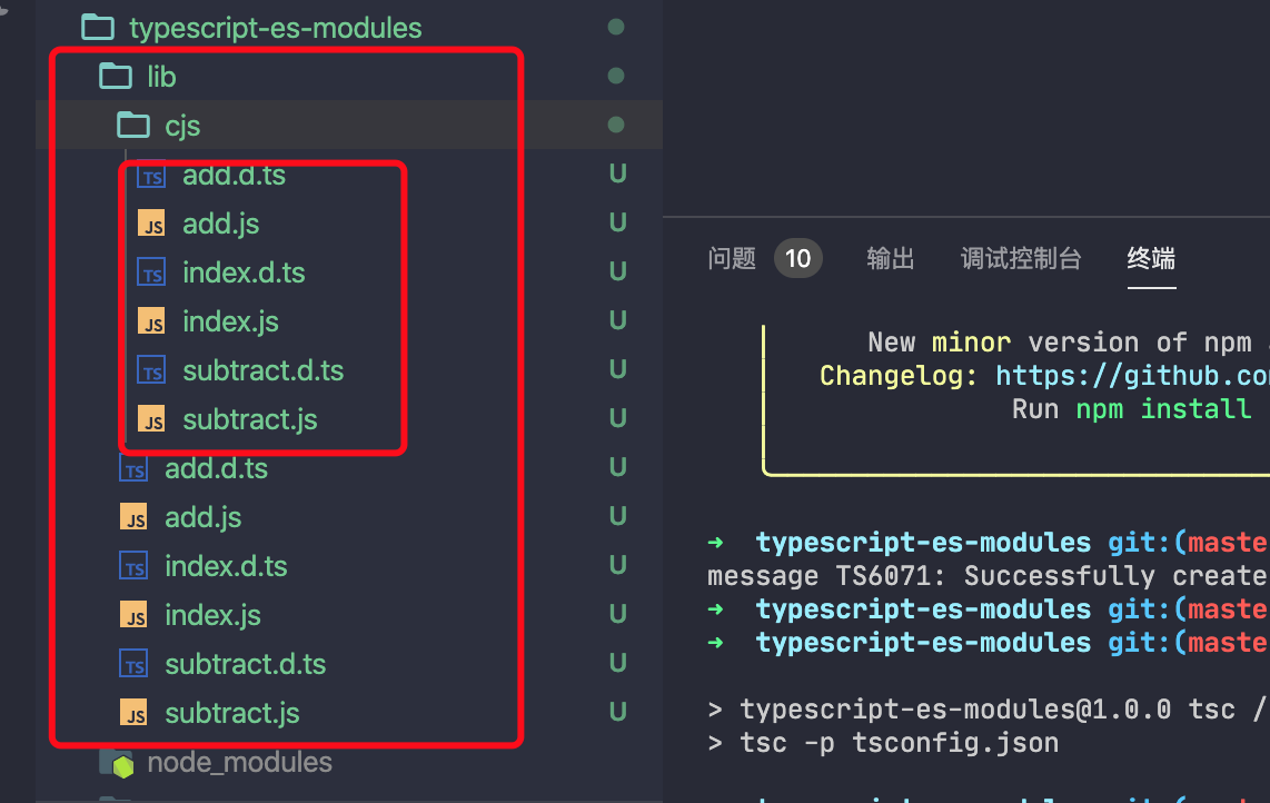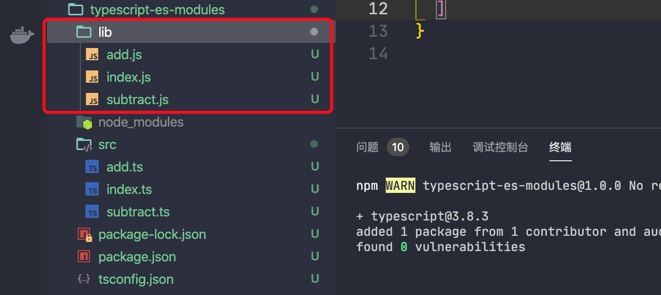 这个有点乱,让我们通过更新 tsconfig 中的 outDir 选项来将ESM输出更新到 lib/esm 中