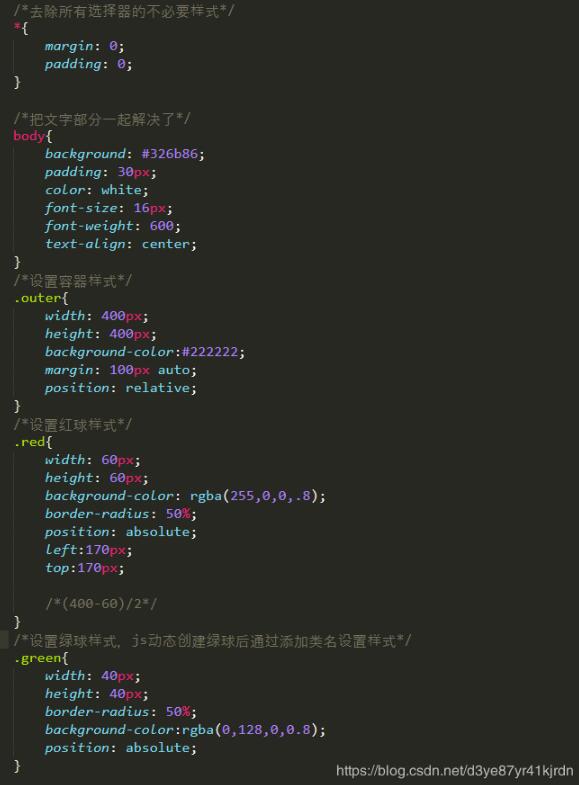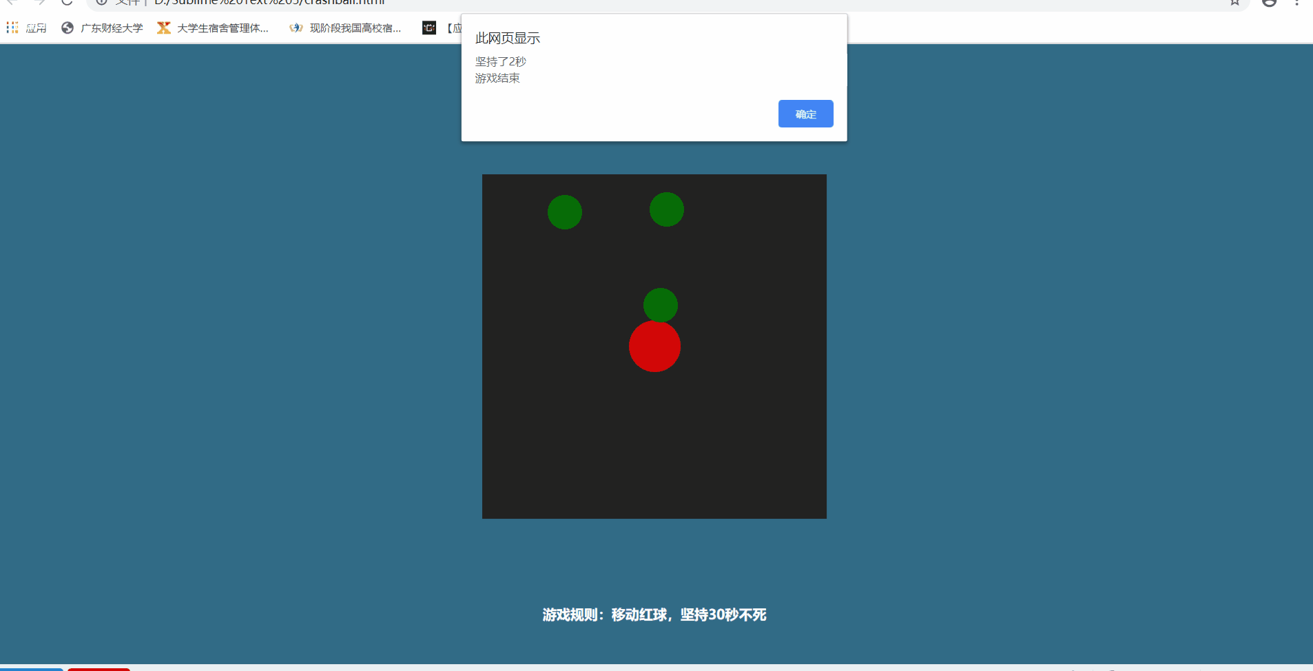 将页面效果的实现细分成小步实现:页面结构的构建,样式修饰,js中小绿球在容器顶部随机位置生成、小绿球非水平非垂直方向的运动、小绿球碰撞容器内壁后弹性运动、生成多个小绿球、拖拽红球、红球的边界判断、红球与绿球的碰撞检测、“坚持n秒”的定时器实现、清除定时器
