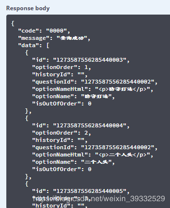 由Swagger测试接口可以看出,给我们的返回数据得到的是这样一个数组,如何将对应的试题内容赋值到相应的控件中,就要用到for循环了