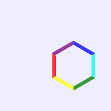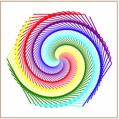 我们先来画一个正六边形。这样作图,设从起点向绘图方向画一条长为i的线段,将线段的终点设为新的起点,同时绘图方向旋转60°,再画一条长为i+1的线段,重复这样的过程共绘制六条线段,则这六条线段构成一个正六边形。