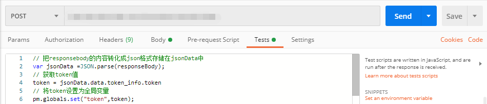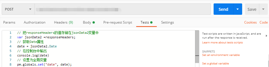 同理,如果我们的token存储在Headers中,而我们想要将这个token设置为全局变量,则只需要将上面的Date属性改为token,并在Tests中增加一行代码即可: