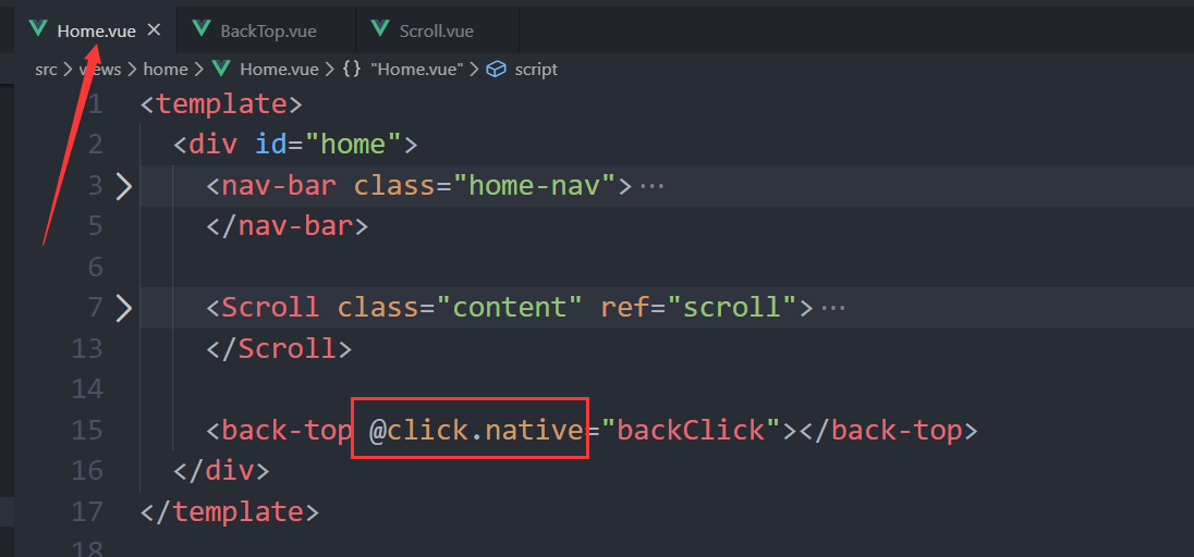 在首页开发中,右下角有一个返回顶部的小箭头,将它单独封装成一个BackTop组件,但是它何时出现需要依赖于首页的滑动,即另外一个Scroll组件。如果直接在BackTop组件里面监听,则需要通过this.$emit将事件发射到Home组件中,又在Home中监听自定义事件,比较复杂。因此,我们直接在Home中对BackTop组件进行监听,使用 .native