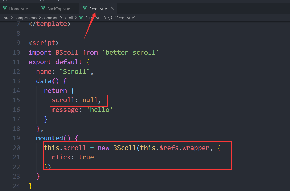 this.$refs.scroll 得到的是 Scroll 组件,this.$refs.scroll.scroll 得到的是Scroll组件中 data 中定义的 scroll属性,