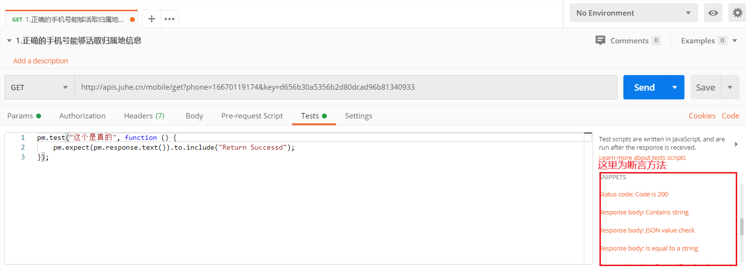 1.选择Tests,在图片右下加选择Respomse body:Contains string的断言方法,