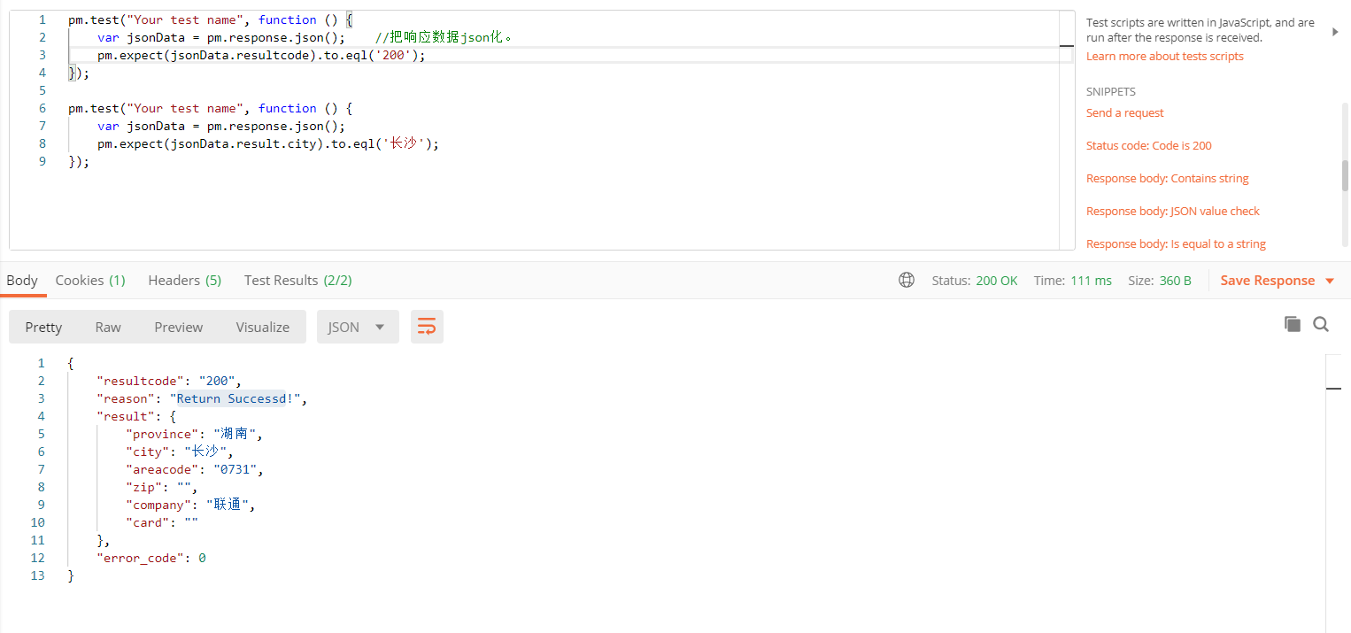 pm.expect(jsonData.result.city).to.eql('长沙');